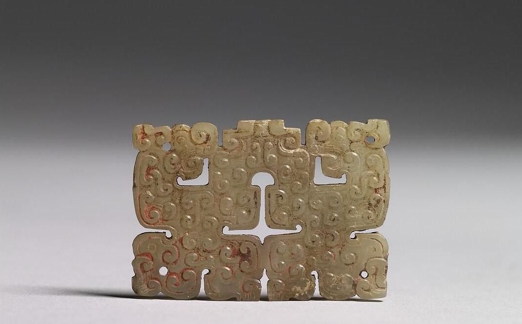 玉质,表面沾有朱砂。方形,镂雕一对龙凤合体,沿轮廓有一圈弦纹,其内浮雕云纹,间有斜线纹。四个角各钻有一孔。