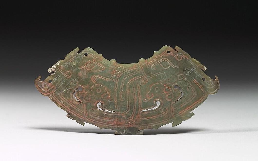 这件双龙首璜中央上端有供系挂的小孔,二端在龙口的位置钻凿圆孔,再以断续细阴线与浅浮雕技法标现似长眉般的飘鬣。可能于晚明至清初时被沁染成褐色。