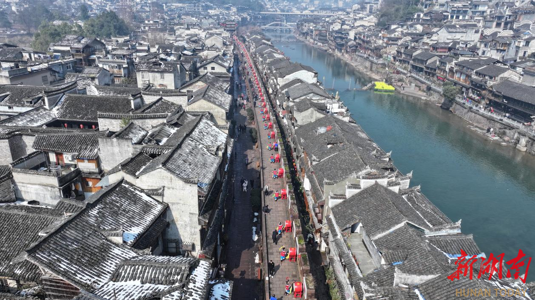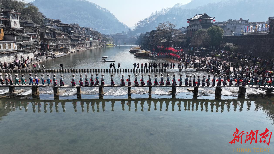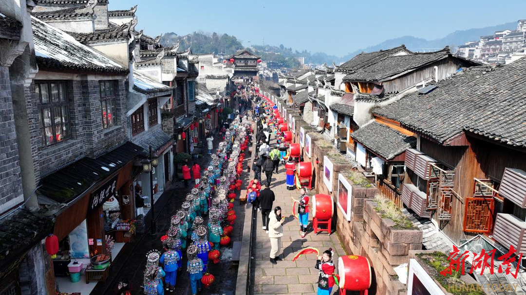 湖南日报·新湖南客户端2月10日讯(特约记者 吴东林 通讯员 肖昕翔 杨籍斌)年味足、民俗丰、游兴浓。2月10日,正值大年初一,湘西土家族苗族自治州凤凰县古城里热闹非凡,人气旺盛,文艺展演、银饰服饰巡游、苗族花鼓迎新春、迎新春书画展等丰富多彩的年味活动热闹上演,为广大游人市民送上一场原汁原味的年俗文化大餐,感受浓厚年味。