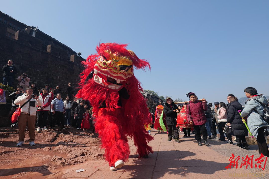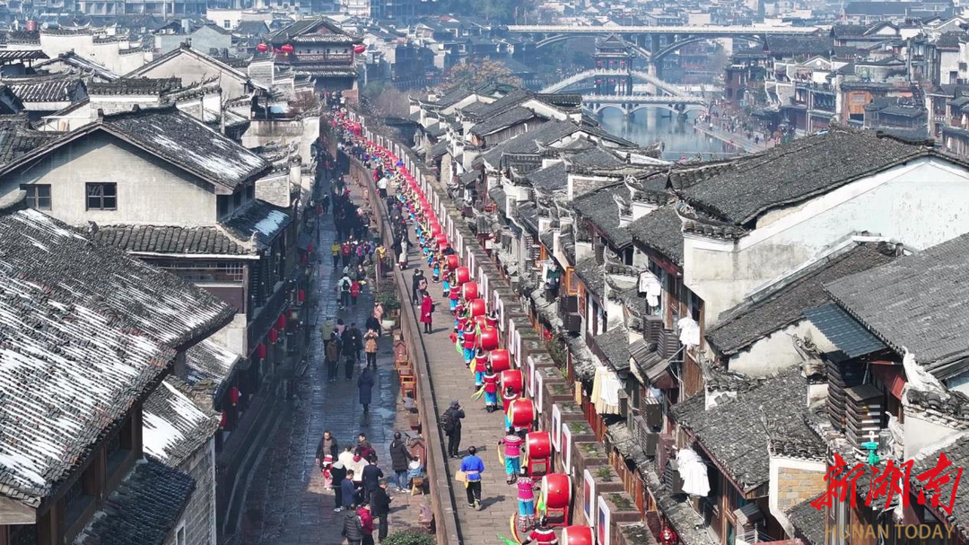 “咚咚咚!”在北门城墙上,一百面苗鼓依次排开,宛若巨龙,甚是壮观,百名苗族阿妹们欢乐地打着《传统鼓》《迎宾鼓》等苗族鼓舞,为广大游客市民呈现了一场精彩绝伦、酣畅淋漓的苗鼓表演。此外,古城里还进行了民间传统民俗巡演、苗族盛装银饰服饰游行活动,舞狮、腰鼓、霸王鞭、蚌壳、花篮等非遗民俗表演者以及苗族盛装佳丽们组成的巡游队伍,穿梭于古城的大街小巷中,驻足在跳岩、北门、虹桥等景点,形成一道靓丽的风景线,整个古城沉浸在热闹的年味中,为广大游客献上了原汁原味的非遗大餐,引得不少游客驻足观看、拍照打卡,近距离体验凤凰浓厚的传统年俗文化魅力。