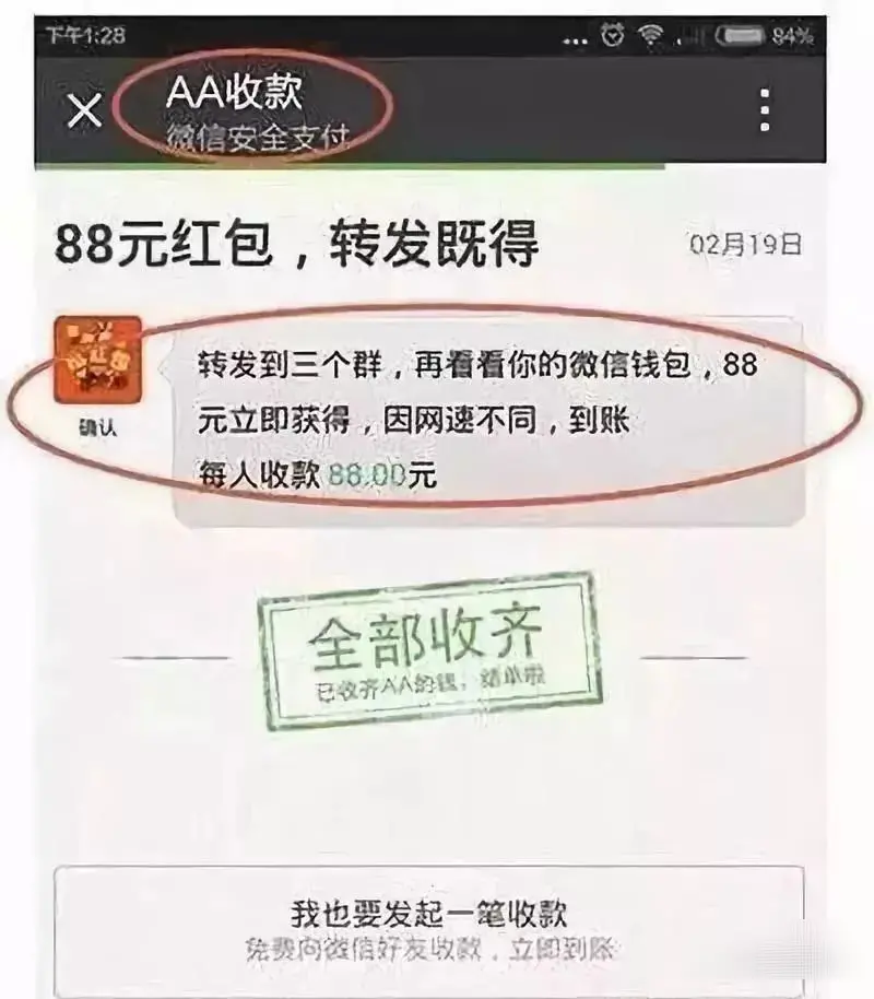 警惕写着“送钱”“现金礼包”“AA红包”等字样的红包骗局。此类红包往往对微信AA收款界面进行略微改动,加上“送钱”“现金礼包”等字样,让用户误以为输入密码是在领红包,但实际上却是给对方转账。