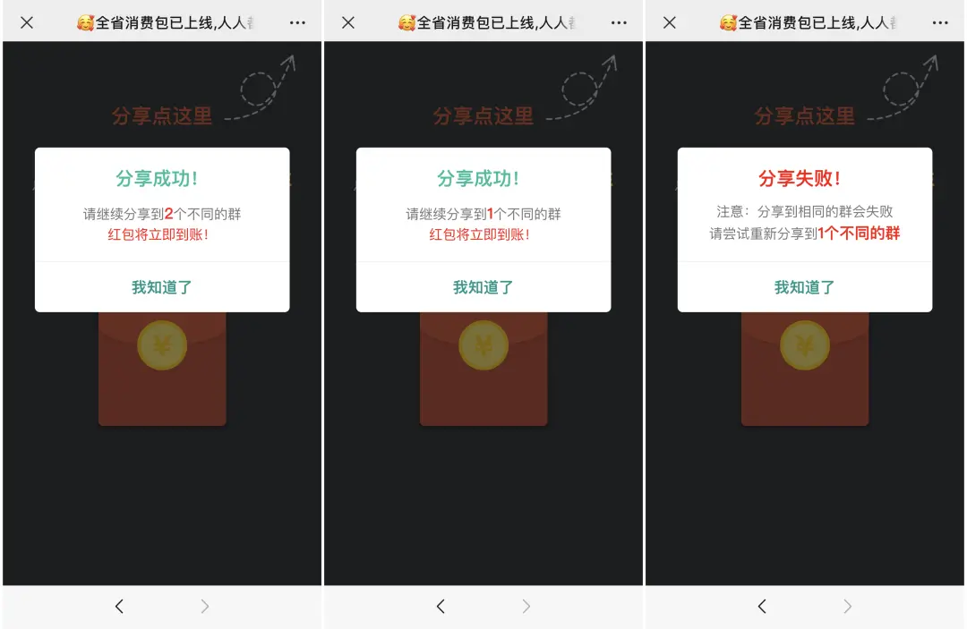 在点击此类红包后,页面提示需要转到其他微信群或分享到朋友圈才能领取。利用微信好友链进行传播,让用户大大降低了警惕,很多人出于对好友的信任,点击后继续分享给其他好友。加上红包流程繁琐,让很多人不愿意“前功尽弃”,造成恶性循环,传播量极广。