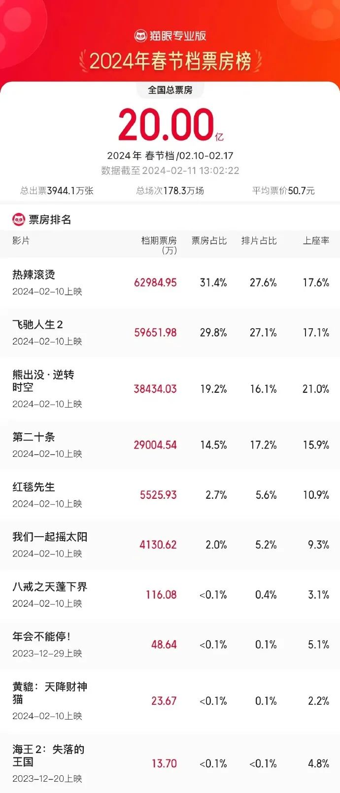 据猫眼专业版数据,2024年2月11日13时02分,2024年春节档(2月10日至2月17日)总票房(含预售)突破20亿元。