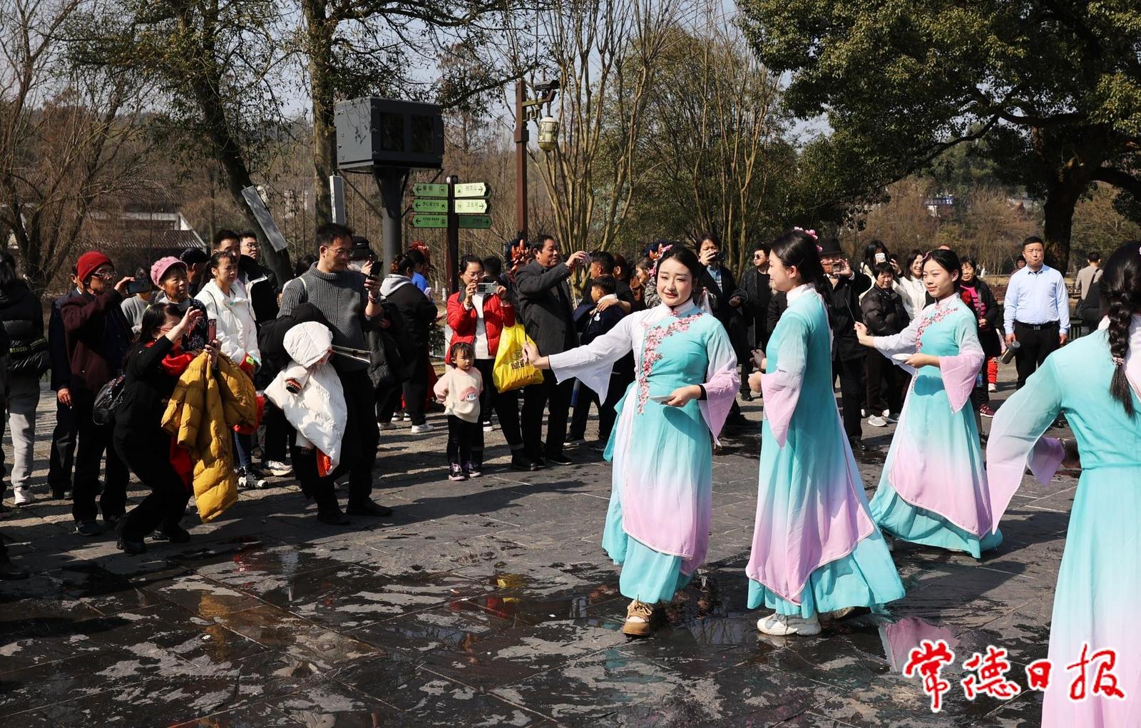 (2月11日,桃花源景区桃花山牌坊前的非遗快闪表演吸引了很多游客驻足观看。)