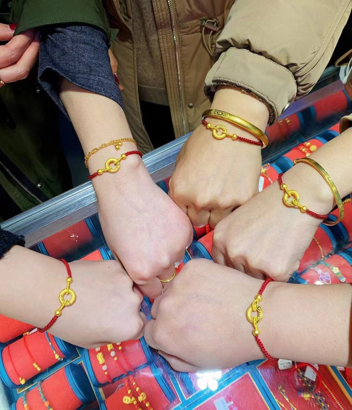 在杭州萧山区一家金店,五位75后闺蜜相约来店里。看了一圈后,她们每人买了一个黄金平安扣。“我们是40年的老闺蜜了,过年了,一起买个平安扣图个平安吉祥的好寓意,金光闪闪真好看!我们刚刚讨论了,明年每人买一条黄金挂坠。”其中一位女士这么说。