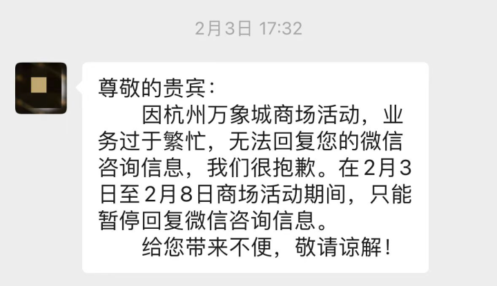 销售人员告诉记者,这几天店铺搞活动叠加春节节点,生意很忙,连店铺的线上咨询都不得不关闭。