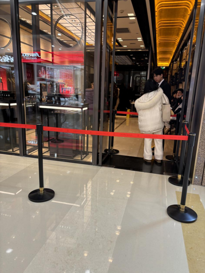 当天,在杭州万象城一家金店,记者同样看到排队现象。有两位年轻女生想进店,却被工作人员告知目前店内人较多,暂停入内,并拉上了护栏,这位工作人员同时还说,如果着急的话,该品牌在商场二楼还有岛柜,那边是开放式的。