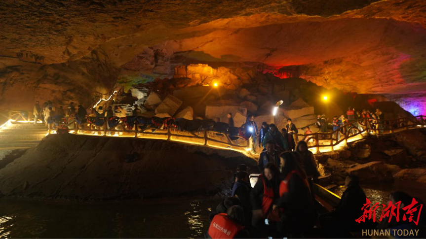 在洞口如鱼嘴的鲢鱼洞,游客们悠哉悠哉地上船,在这里聆听刚从春晚回来的“导游”们唱着的《土家迎客歌》。游船缓缓进入洞里,洞壁钟乳密布,洞内岔洞无数,景点密集,一步一景,构成了千奇百怪、神秘幽深的地下迷宫,栩栩如生。
