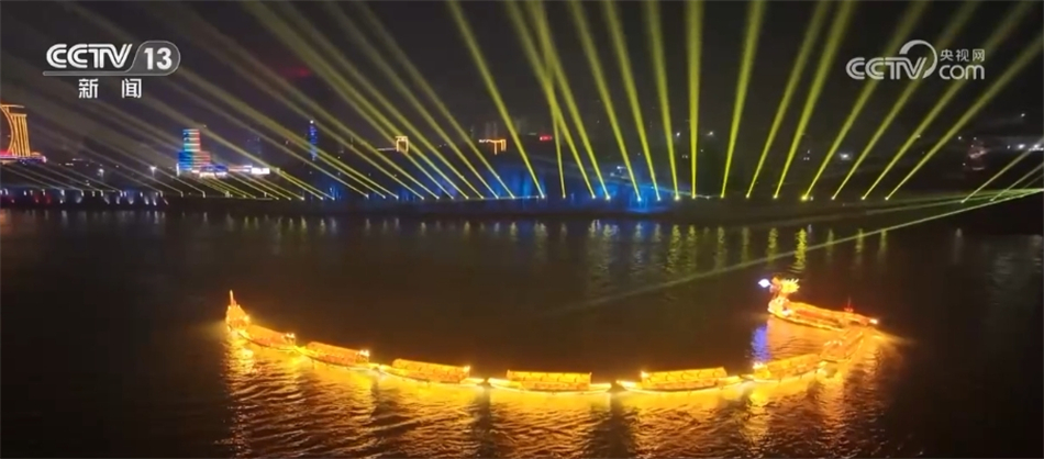 随着夜幕降临,两条“金龙”在一片火树银花中缓缓在汉江河面游动,火红的“凤凰”在夜空中飞舞盘旋,1000套激光灯点亮丹江口大坝,两岸灯光随岸线流淌,色彩变化如梦如幻。