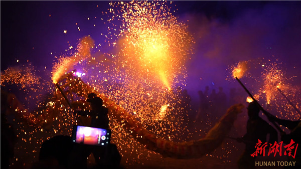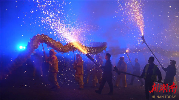 新湖南客户端2月13日讯(记者 黄靖 张程前)2月12日晚,一场精彩刺激的钢火烧龙非遗表演,在湘西土家族苗族自治州凤凰县廖家桥镇的凤凰之窗浓情上演,激情澎湃的表演吸引数千名市民游客前来观看,现场热闹非凡。