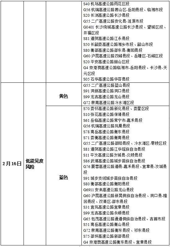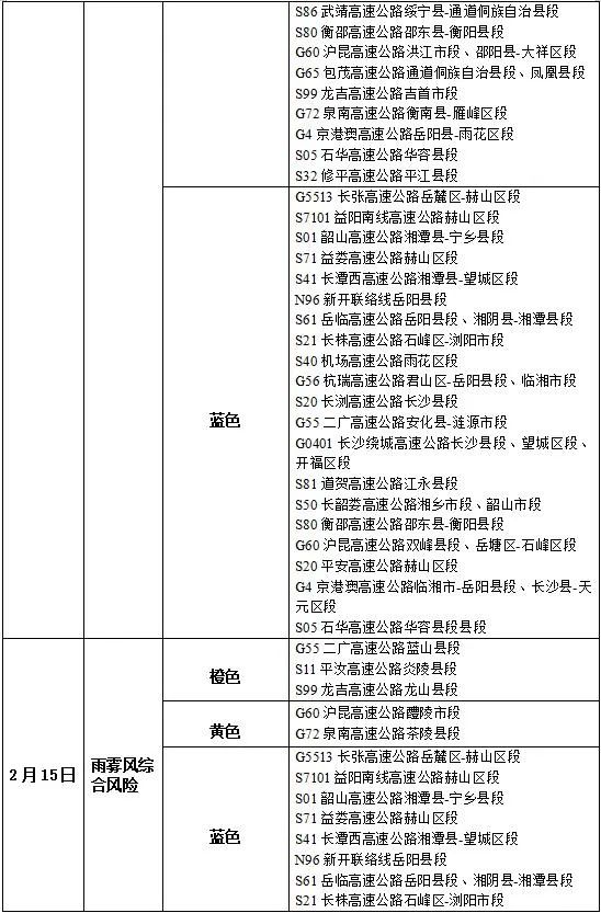 14日受阵雨、雷阵雨影响,湘北、湘中大部分路段存在一定的道路湿滑、能见度下降风险;15日降温降雨、风力加大,16日湘西局地有雾,有一定的交通出行风险,请加强防范。