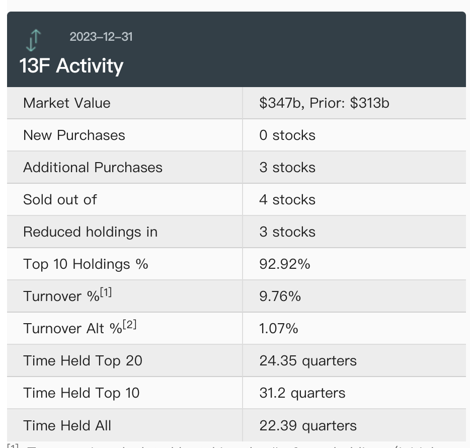 监管文件显示,截至2023年12月31日,伯克希尔的持仓市值为3470亿美元,高于上季度的3130亿美元。
