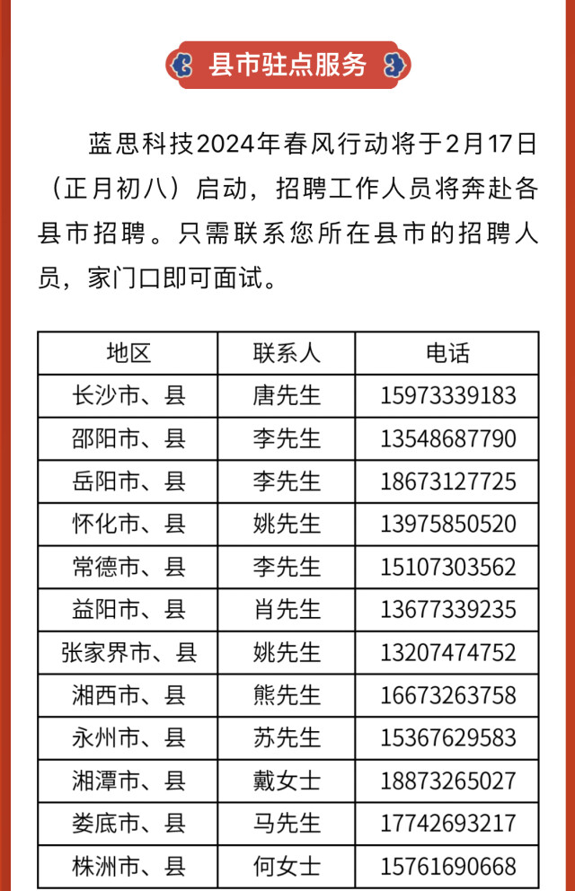 湖南日报2月16日讯(全媒体记者 黄利飞)记者今天从蓝思科技获悉,该公司将在2月17日(正月初八)启动2024年“春风行动”,招聘工作人员奔赴全省各县市招聘,有意向求职者只需联系所在县市的招聘人员,家门口即可面试。