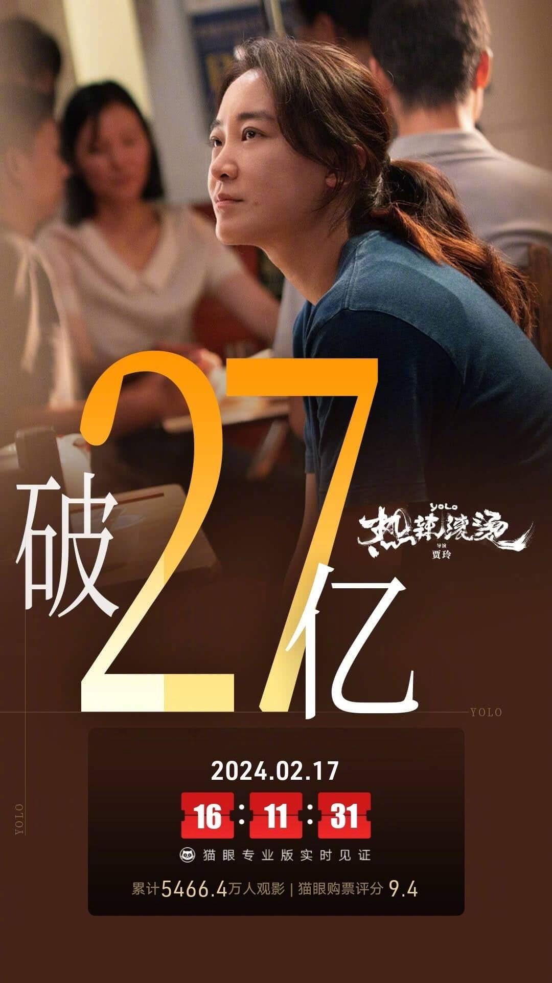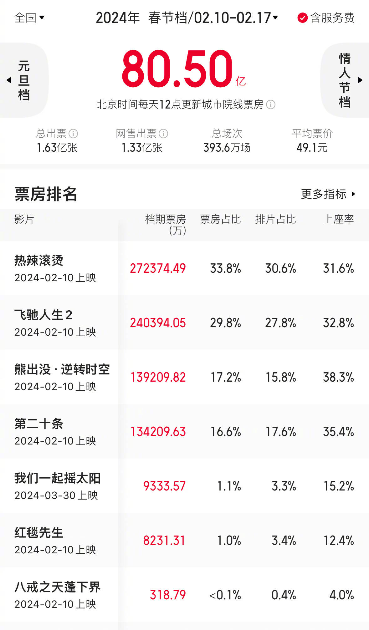2024春节档票房80.5亿刷新影史春节档纪录 《热辣滚烫》27.23亿夺冠