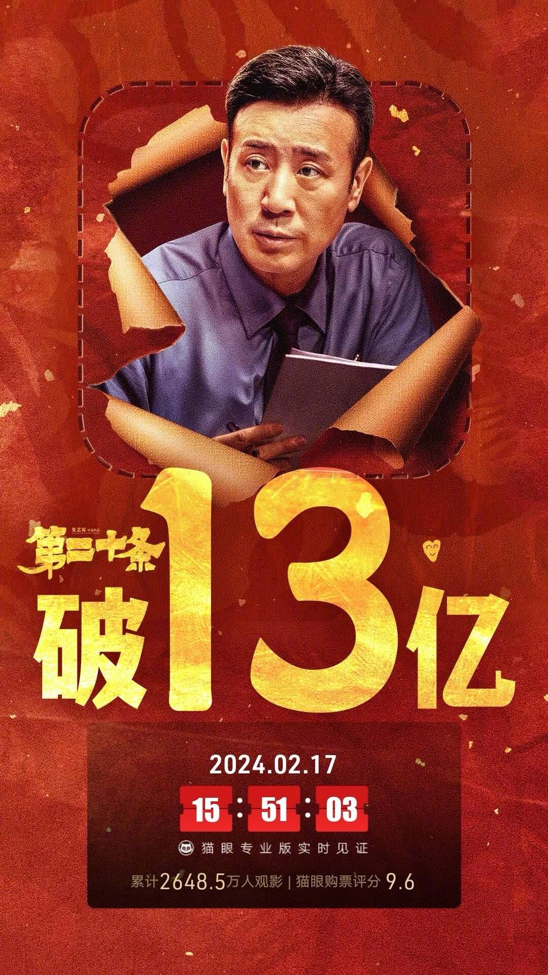 截至2月17日24点,档期总票房达80.50亿。《热辣滚烫》(27.23亿)、《飞驰人生2》(24.03亿)、《熊出没·逆转时空》(13.92亿)、《第二十条》(13.42亿)位列档期票房前三位。