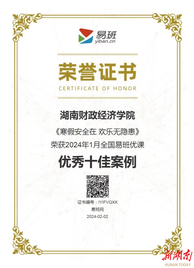 近日,教育部易班发展中心公布2024年1月全国易班优课优秀十佳案例,湖南财政经济学院报送的《寒假安全在 欢乐无隐患》案例成功入选。
