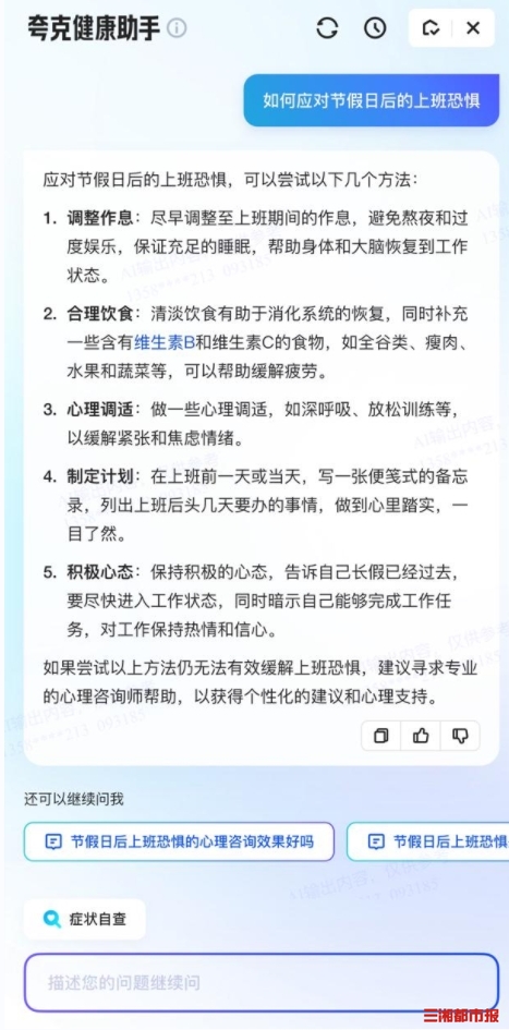 以“节后上班恐惧”为例,医生建议通过积极的心理暗示调整心态,将认知从“为什么又要上班”的消极情绪中拉出来,把精力集中到“接下来应该做什么”的现实生活中,还有如何制定工作计划、调整作息习惯、放松心情以及适当运动等建议可供参考。