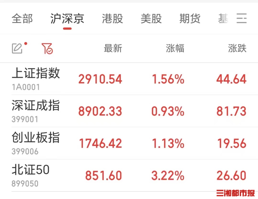 截至收盘,沪指涨1.56%,收报2910.54点;深证成指涨0.93%,收报8902.33点;创业板指涨1.13%,收报1746.42点。市场成交额达到9572亿元。