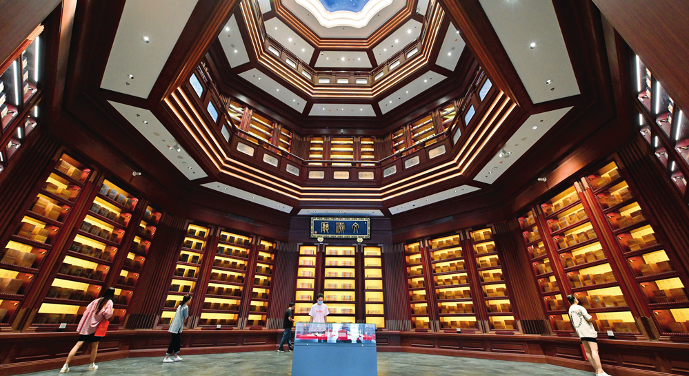 观众在位于北京的中国国家版本馆中央总馆文瀚厅内参观(2022 年 7 月 30 日摄)李鑫摄 / 本刊