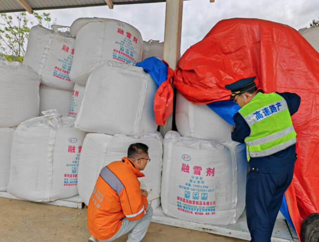 (湖南高速集团郴州分公司汝城南管理所提前储备融雪剂。)