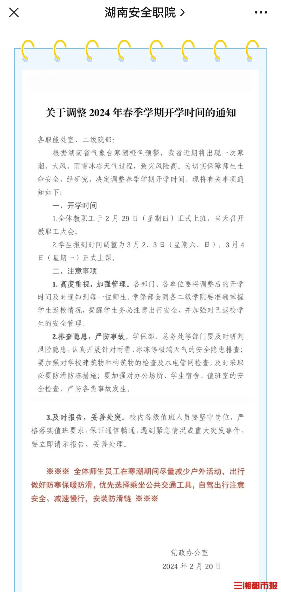 三湘都市报·新湖南客户端2月21日讯(全媒体记者 杨斯涵 黄京 通讯员 于思宇 卞迁)因雨雪冻雨等恶劣天气影响,为学生安全考虑,湖南多所高校发布通知调整春季学期开学时间。