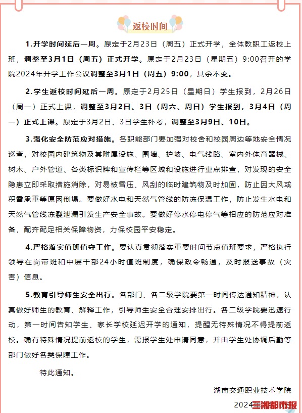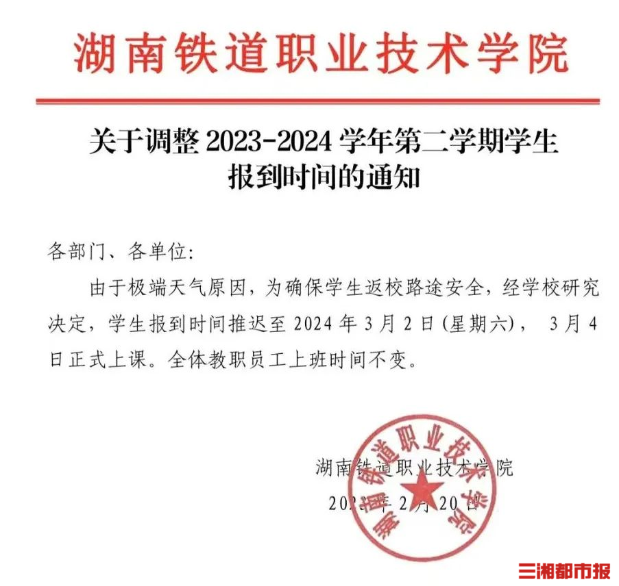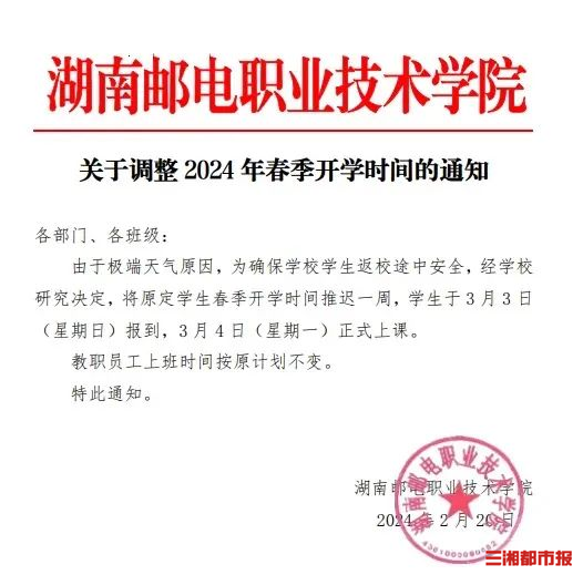 学生报到时间推迟至2024年3月2日(星期六),3月4日正式上课。全体教职员工上班时间不变。