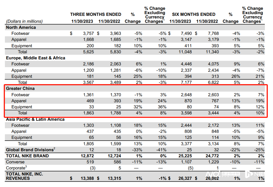 按地区来看,大中华区营收同比增长4%至18.63亿美元,在汇率不变基础上同比增长8%。大中华区也是耐克业绩增长速度第二快的地区。细看大中华区里耐克的各项业务,鞋类营收同比减少1%至13.61亿美元,服饰同比增长19%至4.69亿美元,设备同比增长32%至0.33亿美元。