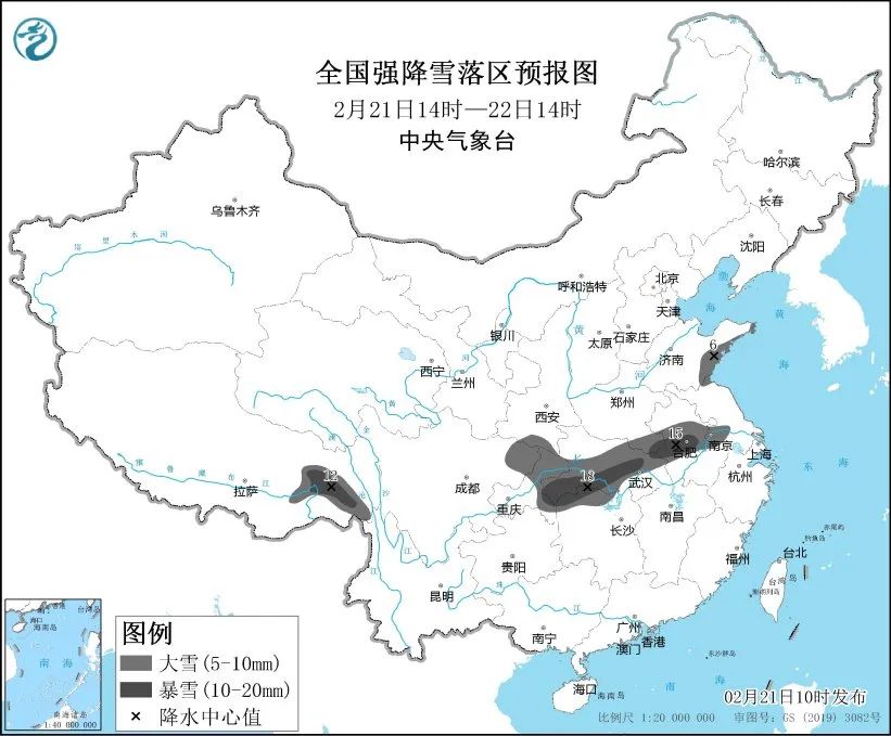 预计2月21日14时至22日14时,山东东南部、河南南部、安徽中部、江苏中部、湖北大部、湖南北部、重庆东部和北部、四川东北部、西藏东部等地有大雪,其中,安徽中部、湖北南部和东部、湖南北部、西藏东部等地的部分地区有暴雪(10~18毫米)。上述地区新增积雪深度3~7厘米,局地可达10厘米以上。