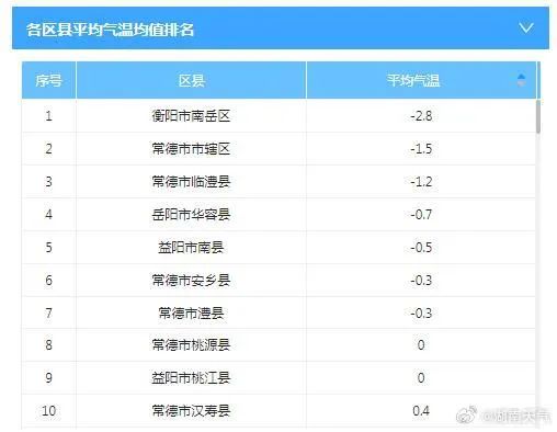 湖南省国家站气温实况监测显示,21日07时至08时湖南大部气温在0至6℃之间,包括常德市市辖区(-1.5℃)、常德市临澧县(-1.2℃)、岳阳市华容县(-0.7℃)、益阳市南县(-0.5℃)、常德市安乡县(-0.3℃)、常德市澧县(-0.3℃)在内的湘北多地气温均不足0℃;衡阳市南岳区为-2.8℃。