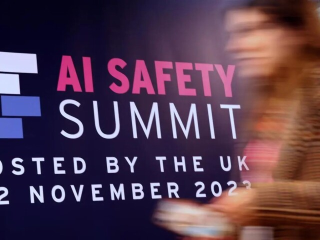 图为2023年11月2日,在英国布莱奇利园,一名参会者经过首届人工智能安全峰会的宣传展板。新华社记者李颖摄
