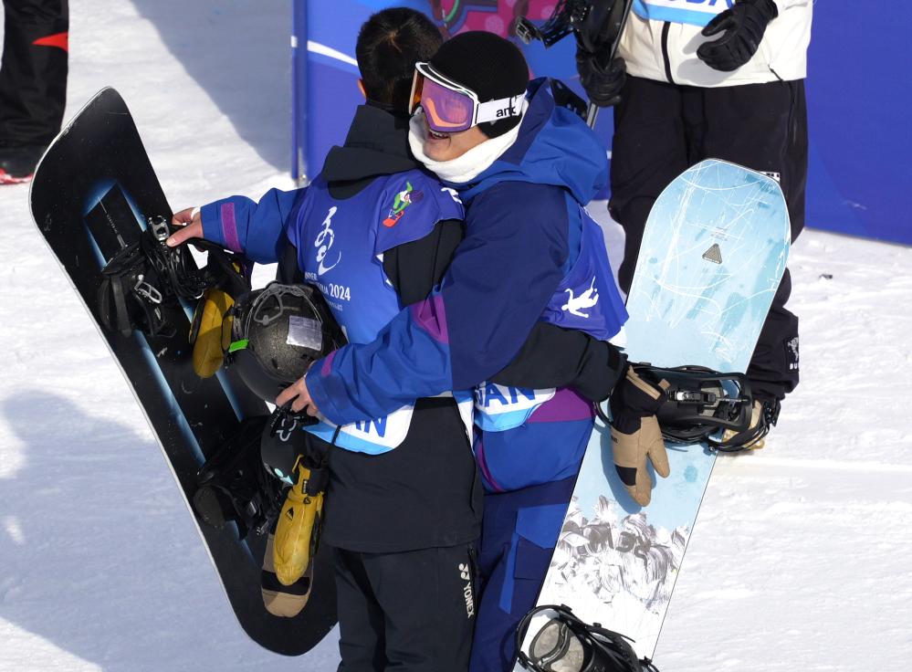 2月17日,北京队选手王梓阳(右)在赛后与队友张义威拥抱。新华社记者 李嘉南 摄