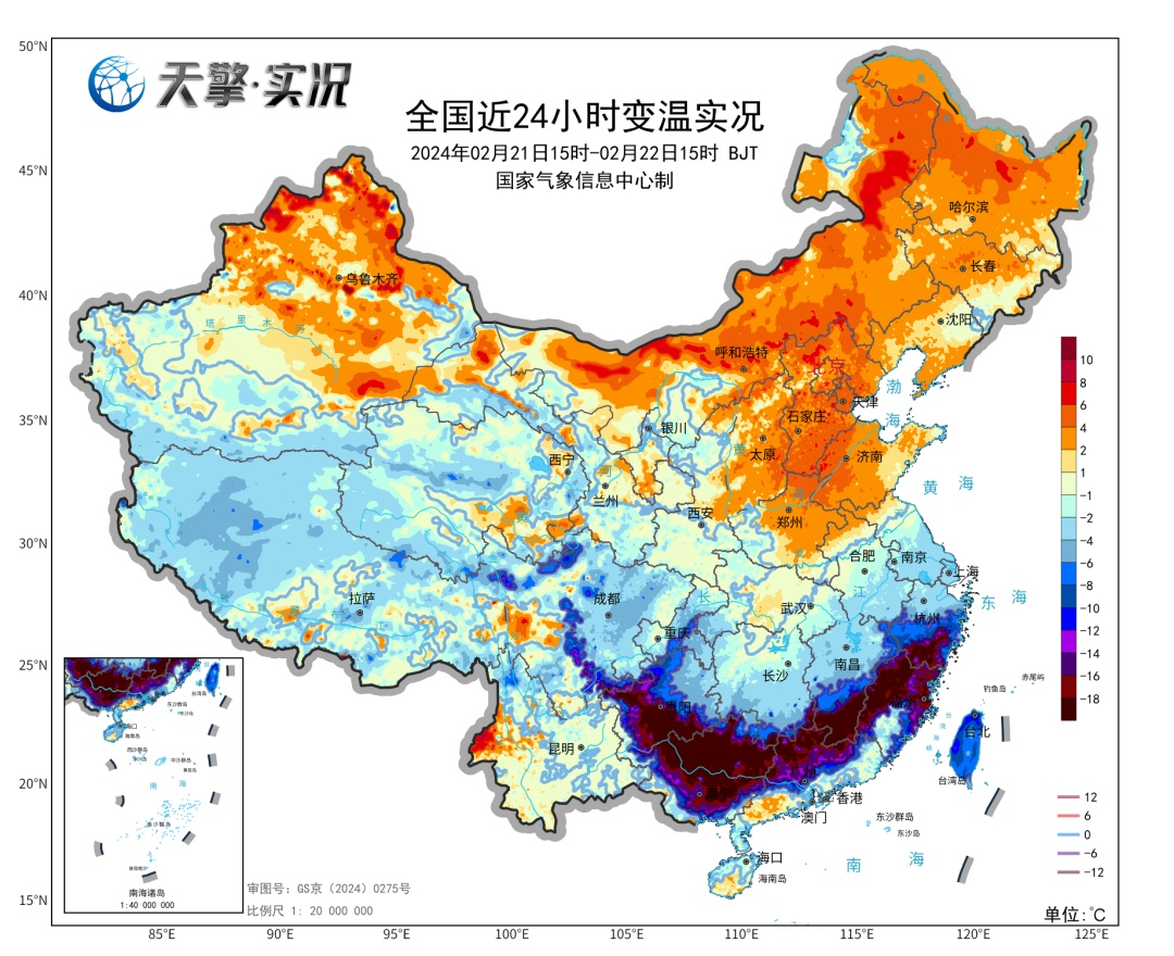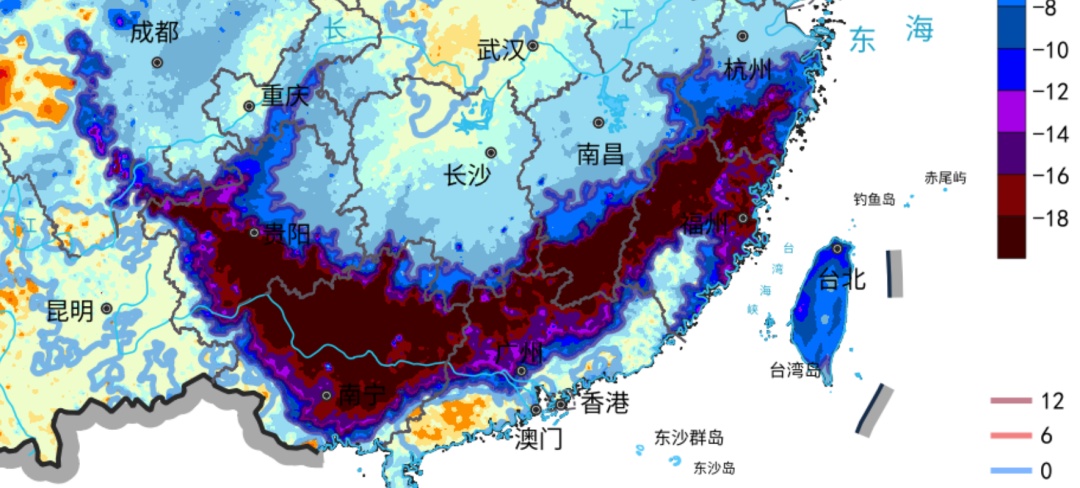 今天14时,在贵州中部、广西北部、广东西北部、江西南部、福建西部和北部以及浙江南部,出现断崖式降温,普遍降幅超过20℃!