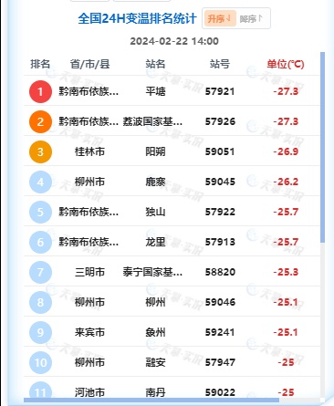 上图为今天14时的24小时变温排名,一天气温直降25℃以上才有资格入前十。像贵州黔南布依族苗族自治州的荔波站,昨天最高气温突破30℃,达到32.1℃,今天14时只有4℃,从夏天直接掉回隆冬。