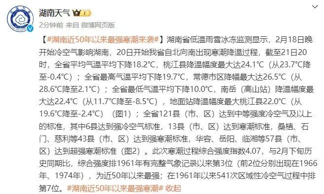 确实,天气正在“癫”成我们不熟悉的样子。今天@湖南天气 表示,这场寒潮对湖南来说,是近50年来最强寒潮。