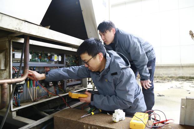 13时40分,张涛到达先锋站,准备好工具包后,熟练地攀爬到站房屋顶。他拿出十子起,打开候车室中央空调控制柜面板,对里面的电源、控制器、接触板进行一轮扫视后,和徒弟李捷说:“你看,空开跳闸,不出意外,又是压缩机过载了”。经万用表测量比较,证实了他的判断正确。随后,他淡定地复位热继电器,又带着李捷调整加注冷媒量,不一会儿机器开始高速运转起来。