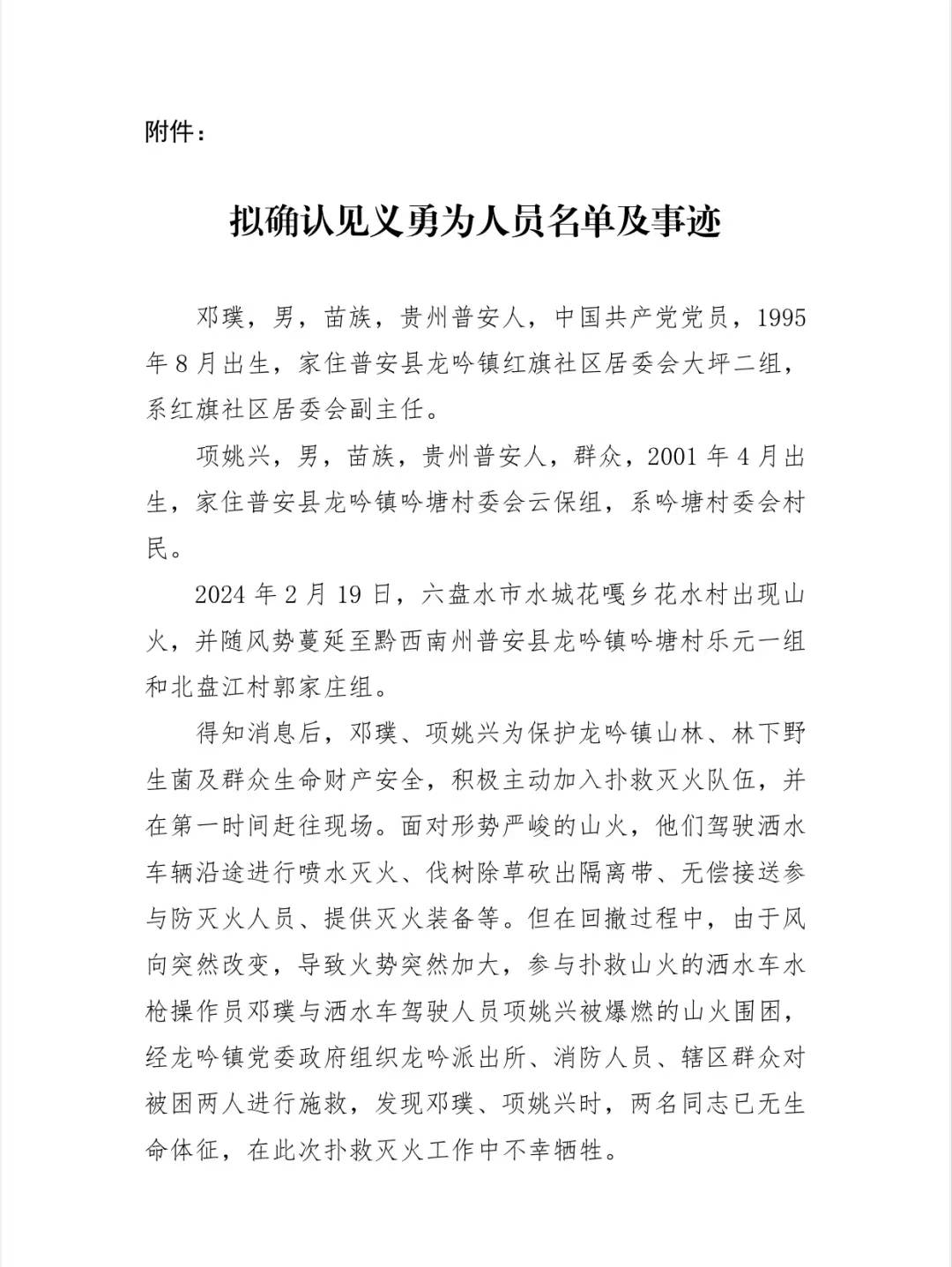 2月23日,普安县委政法委发布公示,拟确认牺牲的邓璞(1995年8月出生,红旗社区居委会副主任)、项姚兴(2001年4月出生,吟塘村委会村民)为见义勇为人员。
