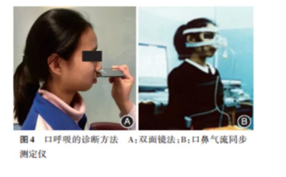 把低于室温的双面镜放在鼻孔和嘴唇之间,观察镜片,上面镜片有雾就是鼻呼吸,下面镜片有雾就是口呼吸。