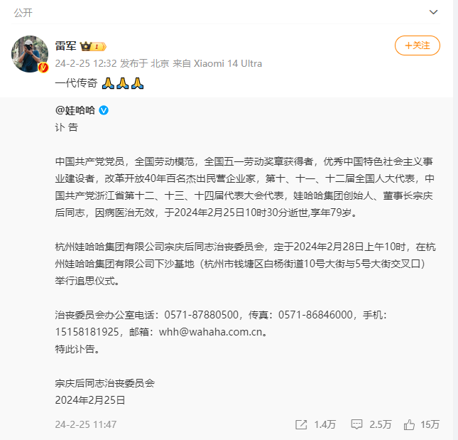 25日中午,小米集团创办人、董事长兼CEO雷军在个人认证微博账号发布消息“一代传奇”,悼念宗庆后。