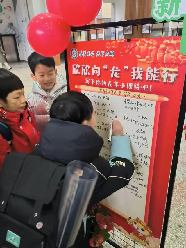 “大家排好队,一个一个来!”校长朱爱朝一边迎新,一边维持秩序,排队打卡的学生络绎不绝。另一边,“欣欣向‘龙’”的新学期许愿板也颇受欢迎,孩子们有的画画,有的写起了“小作文”,有的大笔一挥就是一个“龙”字。面对新学期,孩子们充满了期待。
