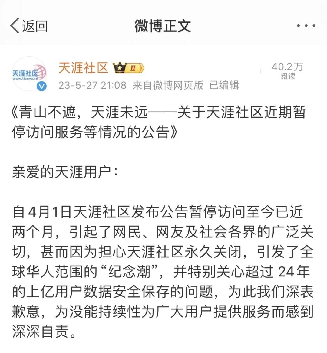 2023年4月1日,天涯社区发布公告称,天涯社区将进行技术升级和数据重构,在此期间平台将无法访问。此公告引起了网民、网友及社会各界的广泛关切,很多人因为担心天涯社区永久关闭,引发了全球华人范围的“纪念潮”,并特别关心超过 24年的上亿用户数据安全保存的问题 。