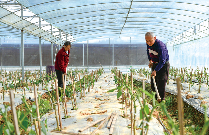 鸡肠子辣椒种植基地的大棚里,村民正在除草。