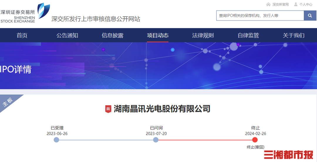 三湘都市报·新湖南客户端2月27日讯(全媒体记者 潘显璇)2月26日,深交所披露,湖南晶讯光电股份有限公司(以下简称“晶讯光电”)申请撤回发行上市申请文件,决定终止对其首次公开发行股票并在主板上市的审核。