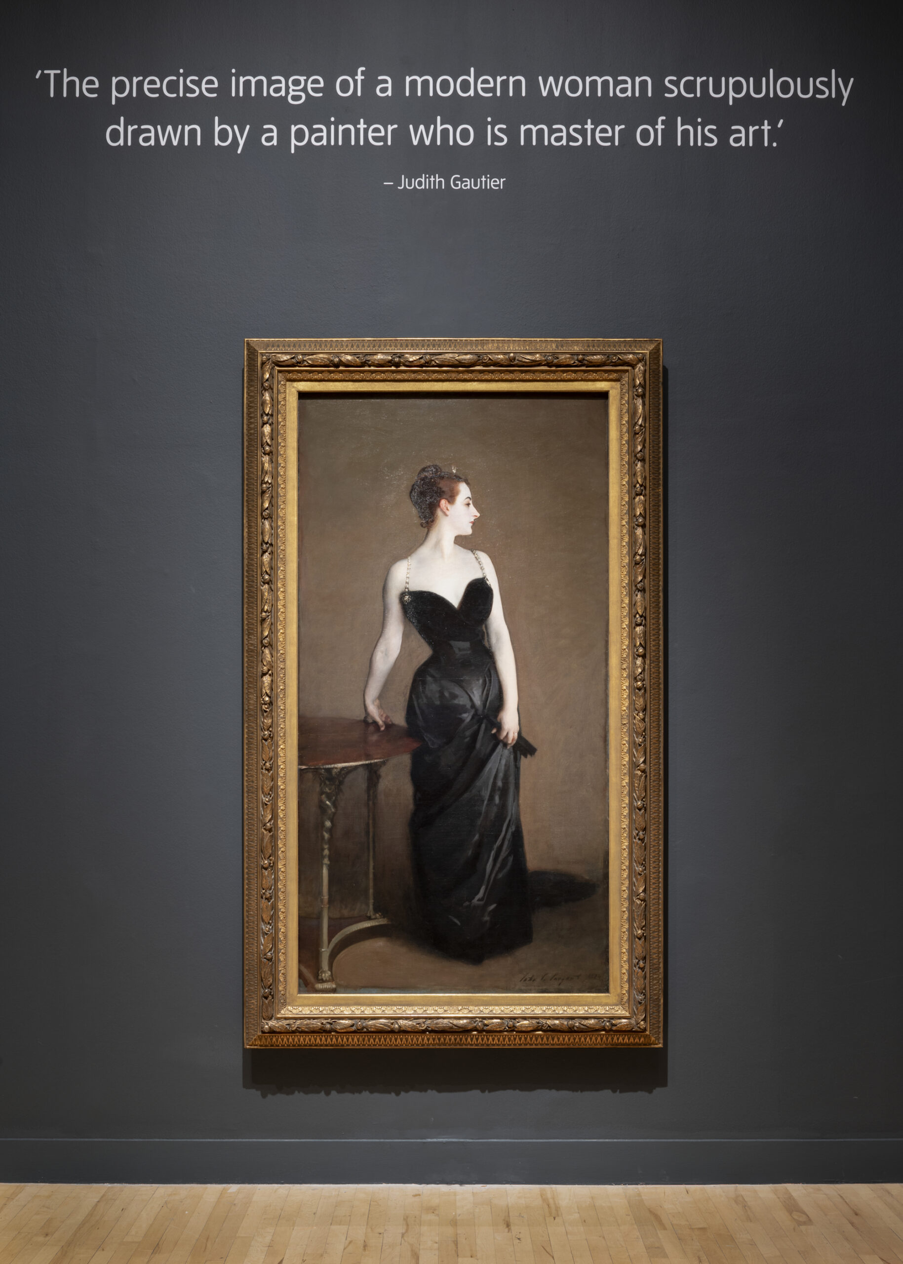 由于萨金特的许多精美作品都是借展,来自纽约大都会艺术博物馆的珍宝《X夫人》的展示方式让人提出严肃的抱怨。这幅描绘弗吉尼·阿梅莉·阿维涅·高特罗身穿露肩礼服的肖像在19世纪80年代是大胆的。即使在巴黎,其暗色材料和苍白、略带蓝色的肌肤对比都曾在1884年的巴黎沙龙展览中引起了震惊。但是,它在一段大字引语下展示,远没有得到应有的重视,它就这么被陈列着,没有任何积累或历史(除了时尚历史)。