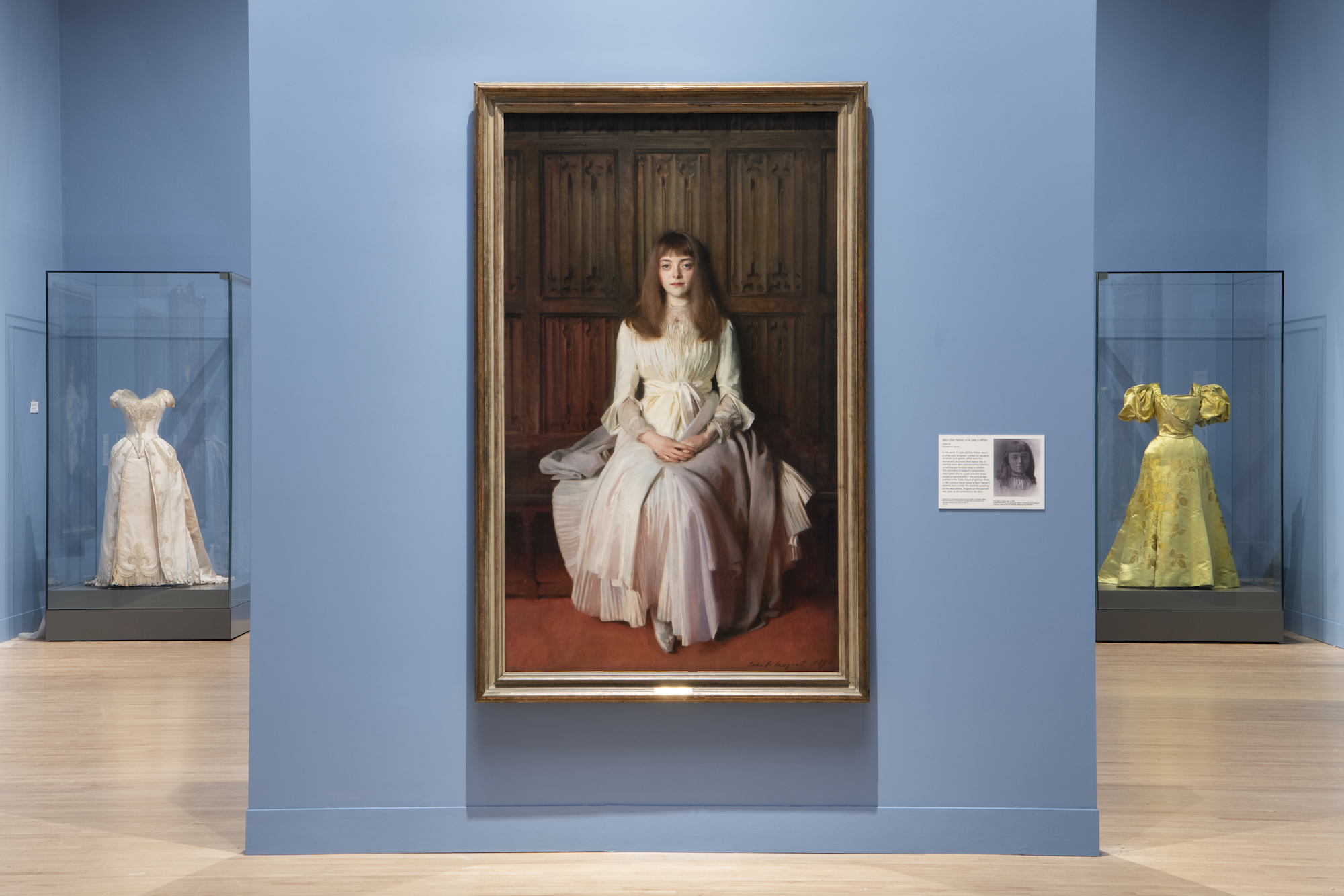 展览现场,萨金特作品《Elsie Palmer小姐》(1889–1890)与 House of Worth 的礼服