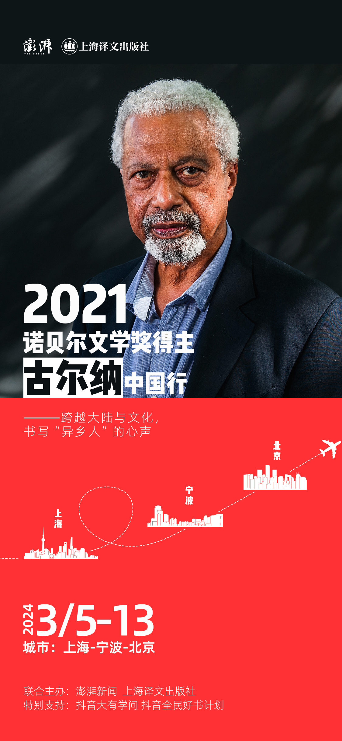 3月5日至13日,诺贝尔文学奖得主阿卜杜勒拉扎克·古尔纳将首次访问中国,在上海、宁波与北京三地展开多场文学与文化交流活动,并与中国作家莫言、孙甘露、格非等对谈。这也是疫情结束以来,首位来华的诺贝尔文学奖得主。古尔纳中国行活动将由澎湃新闻和上海译文出版社联合主办。