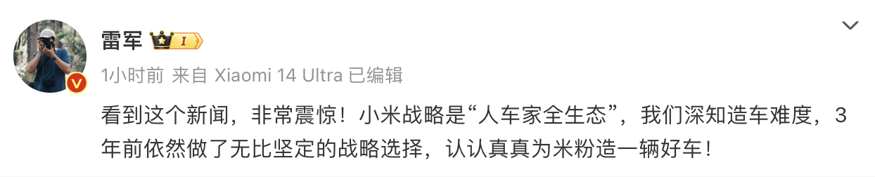 同样表示震惊的还有小米集团董事长兼CEO雷军。雷军表示“非常震惊”,并提到深知造车难度,3年前依然做了无比坚定的战略选择,认认真真为米粉造一辆好车。