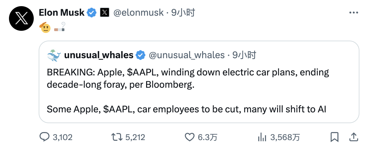 特斯拉CEO埃隆·马斯克在旗下社交媒体X上转发了苹果停止造车的消息,并配上了敬礼和抽烟两个表情。