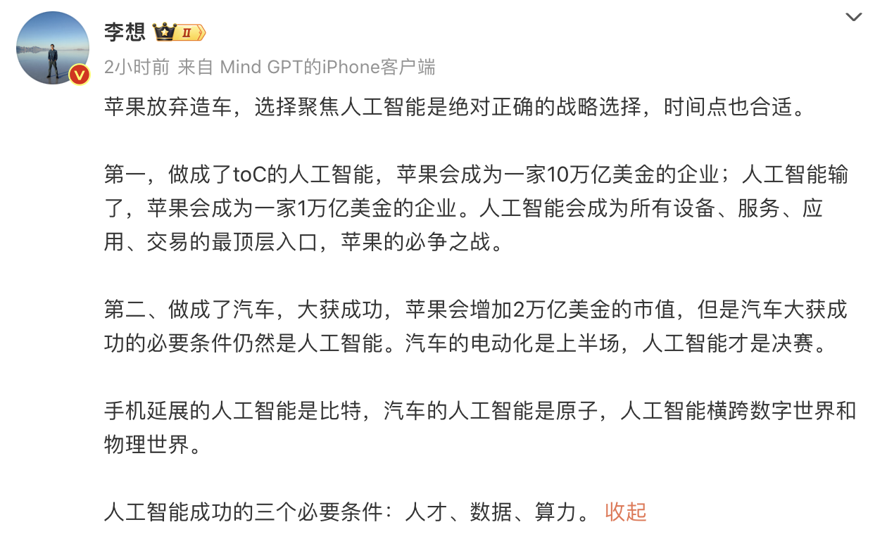理想汽车CEO李想表示,苹果放弃造车,选择聚焦人工智能是绝对正确的战略选择,时间点也合适。