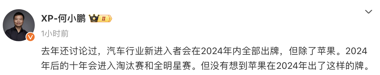 小鹏汽车CEO何小鹏则发帖表达了意外之感,“去年还讨论过,汽车行业新进入者会在2024年内全部出牌,但除了苹果。2024年后的十年会进入淘汰赛和全明星赛。但没有想到苹果在2024年出了这样的牌。”