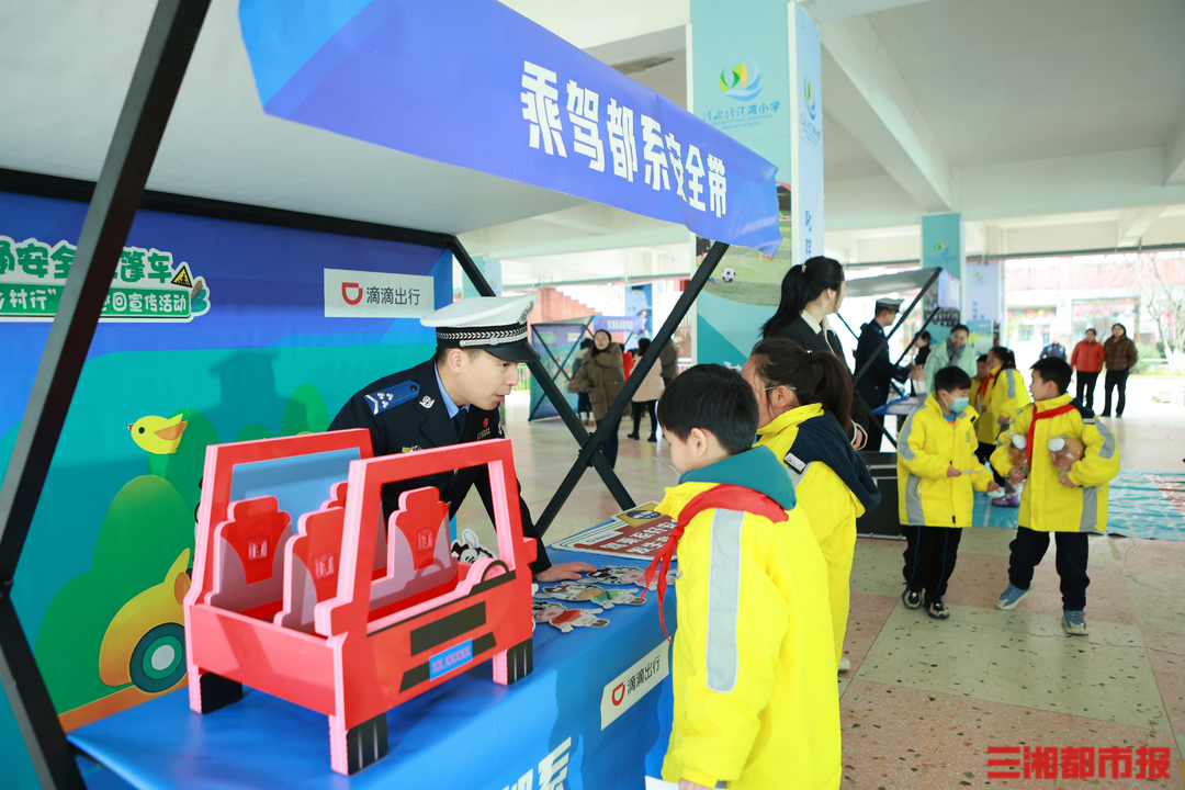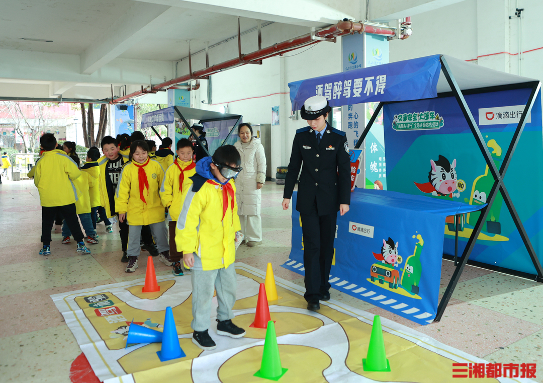 清水塘江湾小学校园内还设置了交通安全游戏展台,在宣讲交警的带领下,孩子们体验汽车盲区,学会如何系安全带、戴安全头盔,认识各类交通标志,体验酒后驾车感觉等。